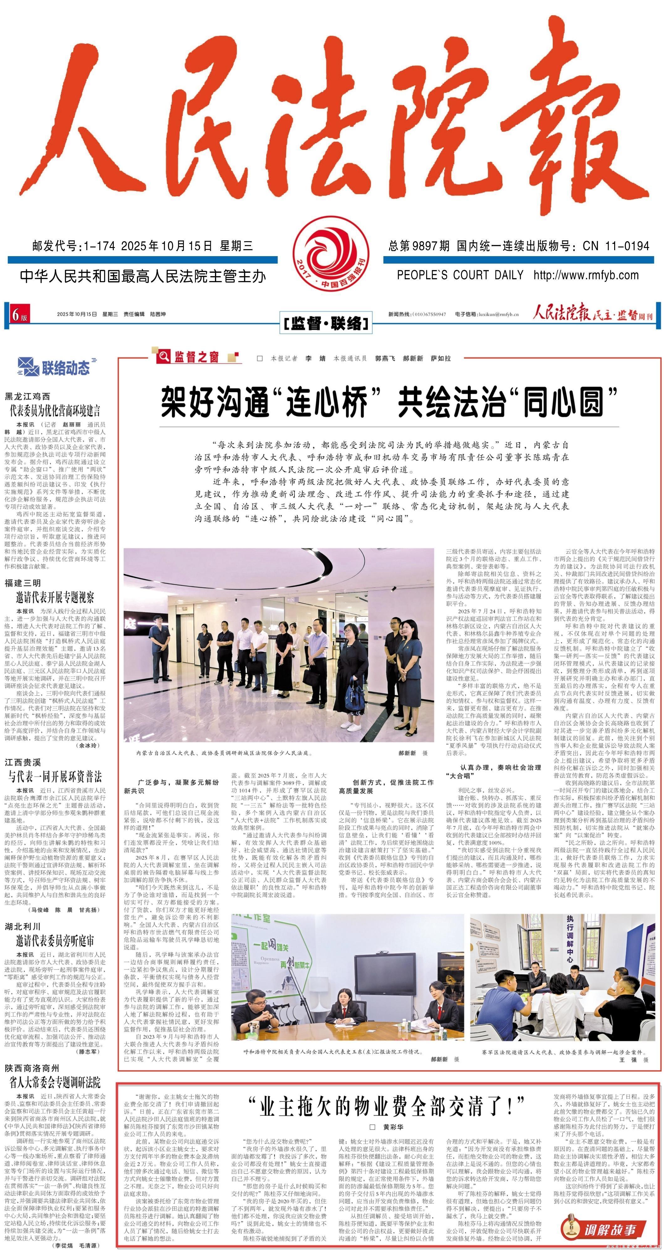 2025年10月15日,《人民法院报》6版刊登我院沙田法庭调解工作报道《“业主拖欠的物业费全部交清了!”》。